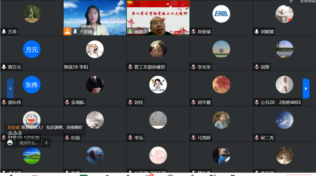 于美丽副教授以《深刻把握党的二十大精神的核心要义与实践要求》为题,从“新时代十年的成就与变革推动中国迈上新征程”“习近平新时代中国特色社会主义思想的世界观和方法论”“全面建设社会主义现代化国家的目标任务”“以党的自我革命引领社会革命的重要要求”四个方面进行宣讲,深刻阐释了党的二十大精神和所取得的重大理论成果,帮助学院师生全面、准确、深入地领会把握党的二十大思想精髓与核心要义。