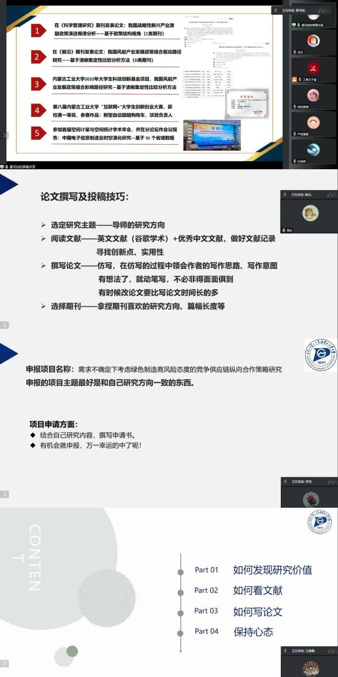 翟羽佳师姐将自己如何参加“互联网+”的过程分享给同学们,结合自己的经验,帮助研一同学更好的进行科研比赛。高化师姐详细的分享了自己论文撰写方法以及一些投稿技巧,希望22届同学们都能取得更好的成绩。李哲师兄全面地讲述了如何申请科研基金,他建议同学们有机会就要尝试,这也是对自己论文撰写方向很好的指导。王健康师兄主要分享了自己看文献的方法,他建议同学们在看文献过程中要勤记笔记,写论文时要专心连贯,这样才能写出更好的文章。