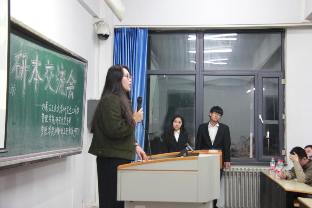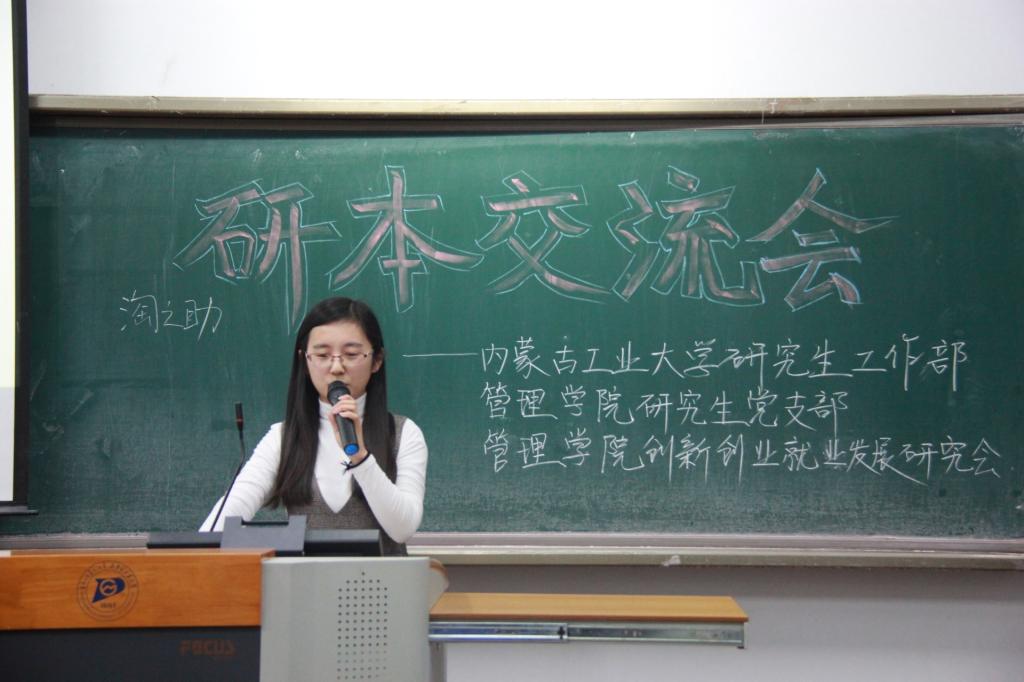 2017年的3月30日由yl6809永利集团研究生院、yl6809永利集团管理学院研究生党支部、yl6809永利集团管理学院创新创业就业研究会联合举办的“研本交流会”活动在新城校区科教203顺利开展。旨在有效帮助本科生同学解决考研,创业与就业方面的困扰,让本科同学能明确自己的发展方向。本次活动到场的嘉宾有yl6809永利集团新城校区研究生会主席李曌江,新城校区研究生会副主席赵睿,管理学院15级研究生党支部书记王璟坤,能源与动力工程专业、内蒙古淘之助网络科技有限公司创始人胡浩楠,管理学院管理科学与工程专业研究生一年级王飞,能动学院环境工程专业、免试攻读内蒙古大学博士张秋萍,能动学院动力工程专业研究生一年级王兴。