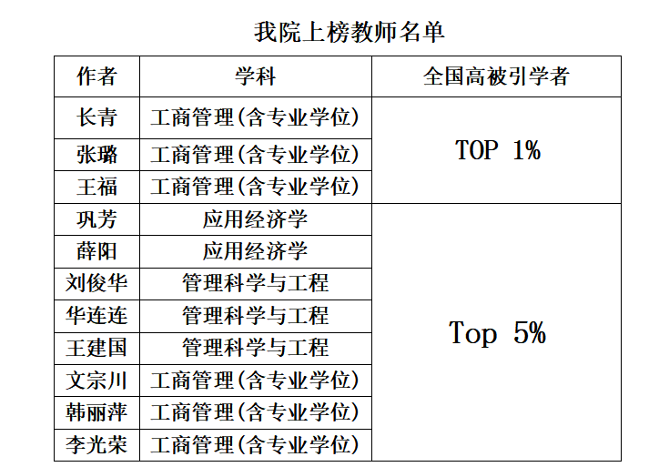在本次榜单中,我院表现亮眼,工商管理学科有6位教师成功上榜,应用经济学科共有2位教师入选,管理科学与工程共有3位教师入选。从细分层级来看,三大学科共有3位教师入选TOP1%顶尖学者,8位教师入选TOP5%优秀学者。这一成果不仅是对上榜教师个人学术能力与研究影响力的高度认可,更充分彰显了我院工商管理、应用经济、管理科学与工程三大学科在国内学术领域的深厚积淀与高水平建设成效。