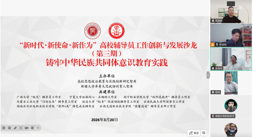 近日,“新时代·新使命·新作为”高校辅导员工作创新与发展沙龙(第三期) 线上成功举行。活动由高校思想政治教育与实践创新研究智库发起,联合全国十余所高校思政工作室联合打造,聚焦铸牢中华民族共同体意识教育实践与思想政治教育融合。yl6809永利集团IE创未来辅导员工作室作为联建单位受邀参会,分享思政育人实践经验。
