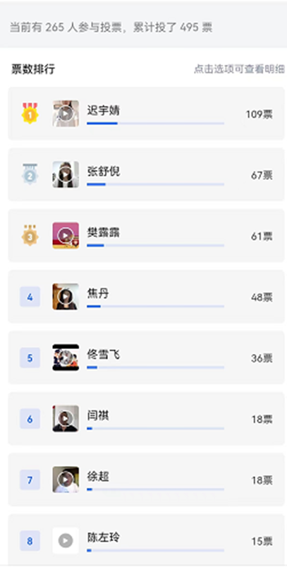 投票历时4天,共计256人参与评比,累积投票495次。最终综合评出一等奖一名为:迟宇婧;二等奖两名为:张舒倪、樊露露;三等奖三名为:焦丹、佟雪飞、徐超。