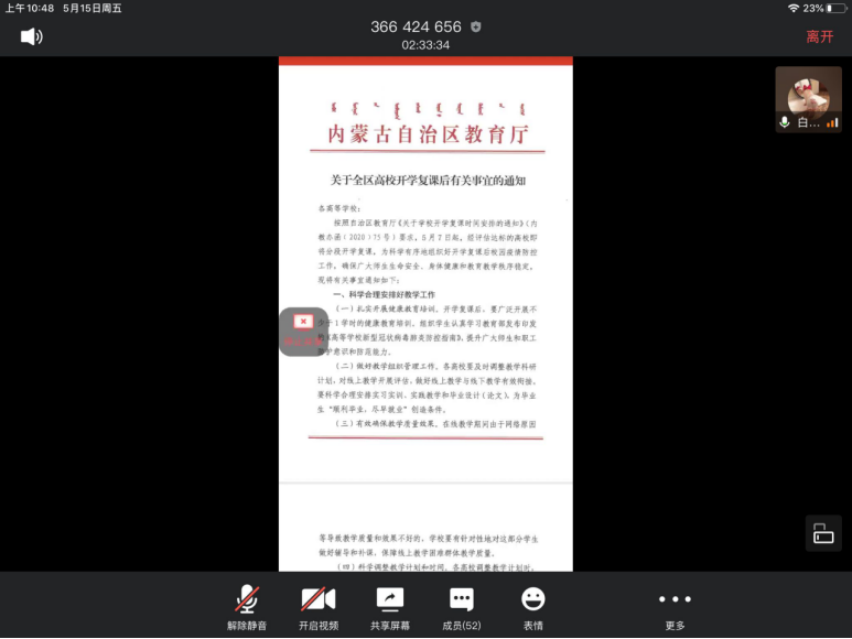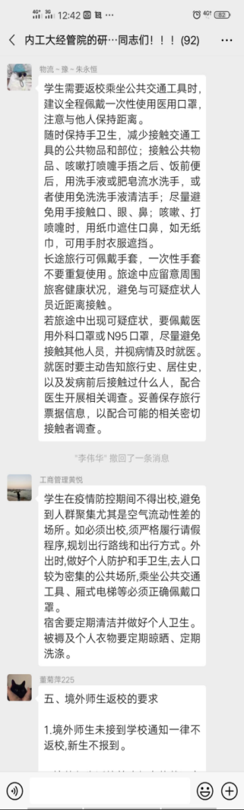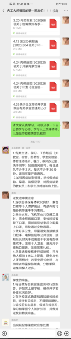 参会人员为yl6809永利官网集团全体研究生,通过腾讯会议进行防控教育相关学习。学院组织研究生们对国家卫健委下发的《关于印发大专院校新冠肺炎疫情防控技术方案的通知》、内防指下发的《关于统筹做好2020年春季学习开学复课和新冠肺炎疫情防控工作有关事宜的通知》、内教疫防下发的《关于开展内蒙古自治区高等院校开学复课疫情防控工作检查评估工作的通知》和《关于印发<内蒙古自治区教育系统应对学校突发新冠肺炎疫情处置预案>的通知》文件进行了认真学习。会议过后,让每位同学认真学习防控疫情文件并将心得分享到班级群,会议准确传达了教育部要求,会议宗旨:做好开学后新冠肺炎疫情防控工作,快速反应、及时控制和妥善处置学校突发新冠肺炎疫情,将疫情传播和次生危害降低到最低程度,确保师生员工生命安全和身体健康,切实维护学校安全稳定工作。