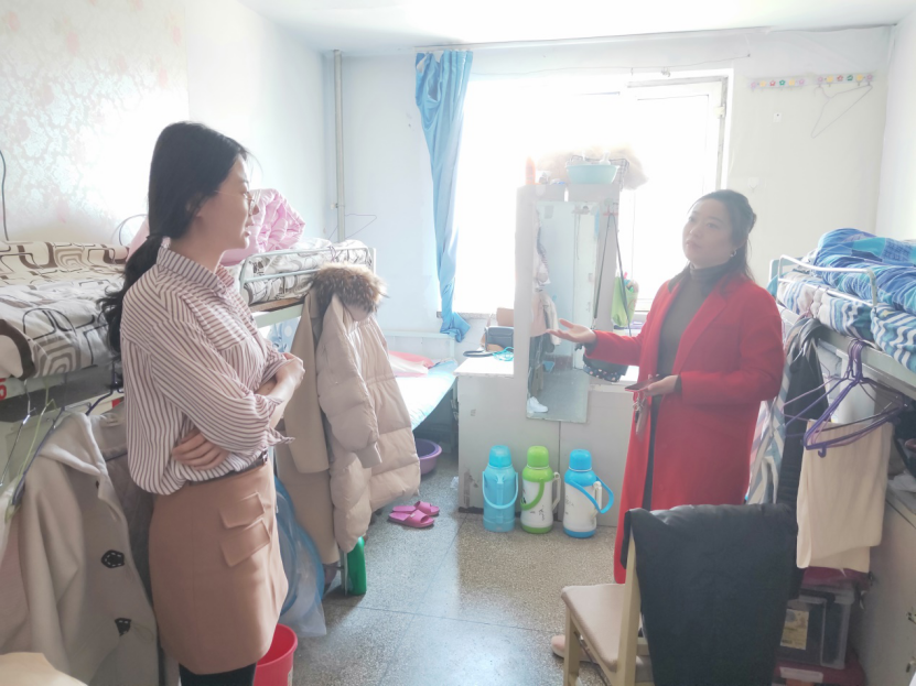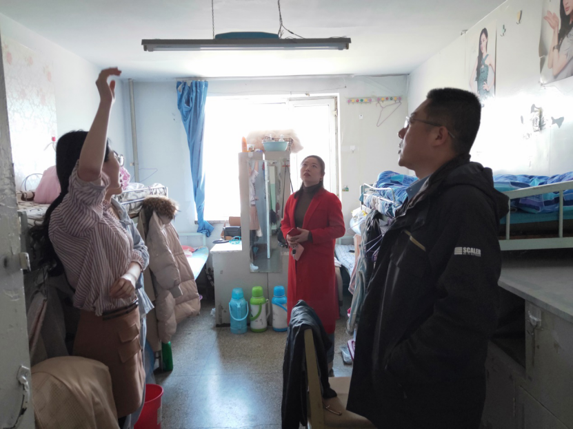 2019年4月1日,辅导员李雪和侯剑老师走访宿舍, 首先问到的就是“宿舍生活还习惯吗?”,并与学生们拉家常。走的时候都会对学生们说“对学校的宿舍管理,有什么建议的请多多提出来。”细致入微的关怀,学生们都表示很感动。