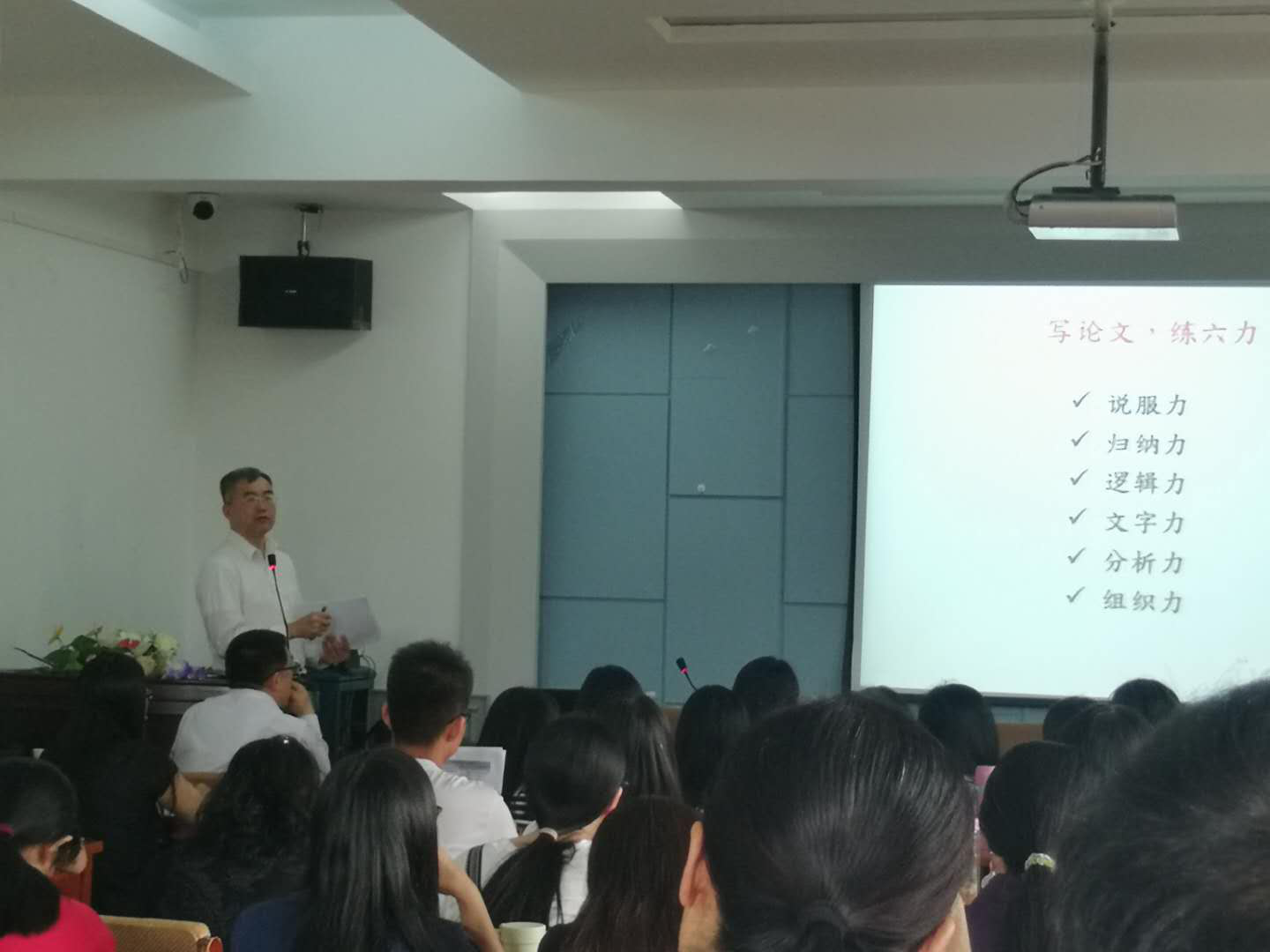 张教授结合自己的论文写作及发表经验,十分幽默生动细致地分享了在写论文时,论文结构之间的联系,以及研究设计、实证结果诠释等方面的内容。在张教授的讲解过程中,不时穿插自己的写作过程的经验,引起了老师及同学们的广泛共鸣。之后,张教授与老师及同学们进行了互动,回答了老师及同学们提出的自己在论文写作过程中的困惑和问题,张教授对这些问题一一进行了耐心的解答。有同学提出如何进行论文选题,张教授结合他自己的论文写作过程中的经验跟大家分享,他提出要多观察,观察身边的顶级学者们在做什么,对于一些在知网上难以找到相关研究的论文,就要思考,别人为什么不做?这个问题是否有研究价值等等,这样角度新颖的回答让大家受益匪浅。