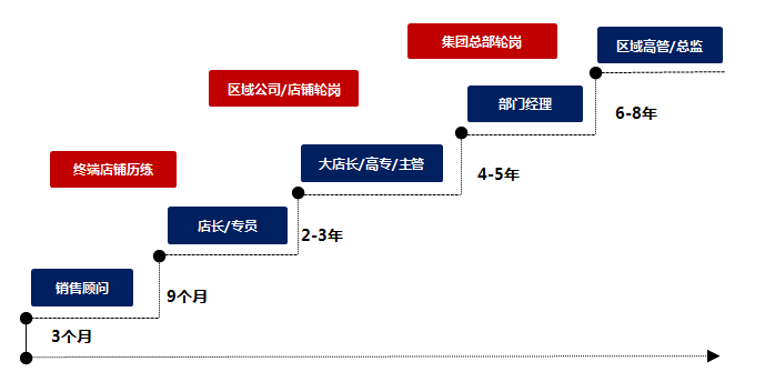 2)三年内零售终端基层培养,其中包括:店铺销售精英—店长—区域主管;