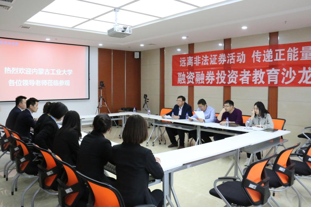 3月22日下午,调研组对我院学生实习的恒泰证券内蒙古分公司及国泰君安呼和浩特分公司进行了走访、调研。详细了解了金融15学生顶岗实习的具体情况。并与国泰君安呼和浩特分公司领导进行了座谈,双方就学生实习,校企合作等相关情况深入交换了意见。随后,学生代表王欣向大家汇报了两周的学习情况,表示两周的实习让他们对证券行业有了深刻的了解,也让他们明确了自己的就业方向。