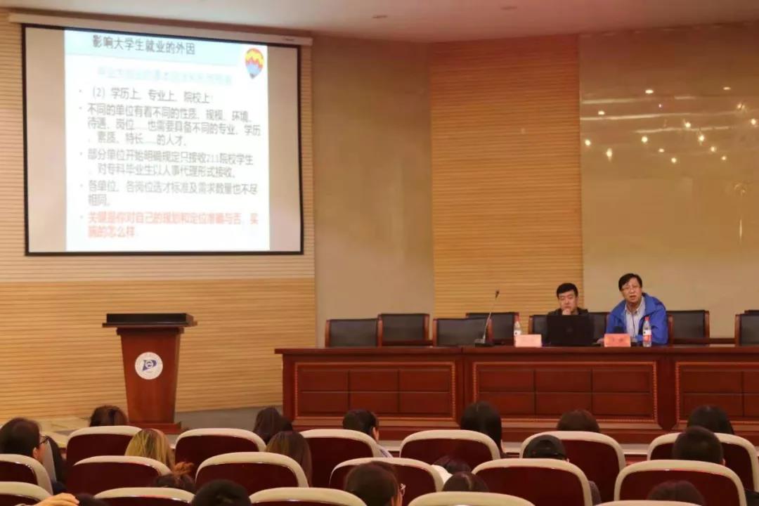 会议开始,邹斌老师从同学们的日常生活谈起并层层深入,从影响大学生就业的因素、转变就业转念、树立基本的择业观念、鼓励毕业生面向基层就业等方面展开,让毕业生们对就业有一定的初步认识和了解。接着,邹斌老师就“鼓励毕业生面向基层就业”与“如何正确签订就业协议书”展开详细介绍,提醒同学们在就业地域上勿扎堆式聚集在北上广,而西北华北等地域也为毕业生提供了很好的选择。随后,冀强老师就目前的就业形势进行了详细讲解,并通过大数据分析全国人才流动及历年我校毕业生就业情况,建议同学们脚踏实地,正视自己,把握机会。