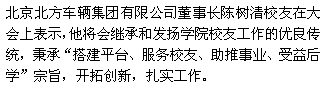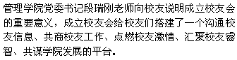 2013年12月7日下午,管理学院北京校友会成立大会在北京用友软件园隆重举行。yl6809永利集团管理学院党委书记段瑞刚,院长长青,校学术委员会主任李长青,副院长王秀丽、张建及部分校友参加此次成立大会,北京北方车辆集团有限公司董事长陈树清、北京市中关村航天创新园科技发展有限集团公司副总经理高歌等校友代表出席了大会。大会由学院党委书记段瑞刚主持。