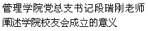 校学术委员会主任李长青讲到,校友是与学院共同成长的,校友是学校的骄傲。从走动开始,校友需经常来往,共同进步。校友会能延续至今,靠的是一个组织的文化,靠的是不带功利的色彩,靠的是管理精神。没有管理任何技术能力都是无效的,管理不是一成不变的,组织管理中需要不断创新。目前管理学院正在采用三维情景教学法,将使学生在自主、合作、创新方面得到锻炼。我认为在校友和学院的共同努力下,将来管院校友的成绩会更上一层楼,管理学院会更加美好。