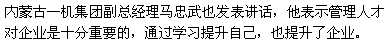 内蒙古一机集团副总经理马忠武也发表讲话,他表示管理人才对企业是十分重要的,通过学习提升自己,也提升了企业。而校友会是发掘人才最大的资源和渠道。