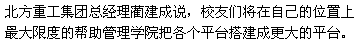 北方重工集团总经理蔺建成说,校友们将在自己的位置上最大限度的帮助管理学院把各个平台搭建成更大的平台。这是一个很大的资源,学生有更多的机会走向企业,让学生与管理实践结合起来,改变办学思路,让毕业的学生更受社会欢迎。管理学院为北重集团培养了三期二学位,MBA等人员,为北重培养大批管理人才。下一步北重集团将与学院进一步合作,为学生提供实习机会,丰富同学们的社会阅历,同时学院也将为北重输送更加优秀的学生。
